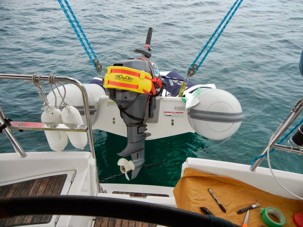 Peu de chose à dire pour ces derniers jours. Denis a continué à améliorer le dinghy en lui ajoutant quelques renforts au position de ragage. En particulier à la limite entre la plage arrière et les boudins où l'ancienne toile de protection avait couper une partie du renfort.